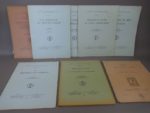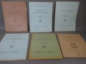 Poujade Jean - Documents d'Ethnographie Navale rassemblés par Jean Poujade, membre de l'Académie de Marine, Attaché au Museum National d'Histoire Naturelle. Publications du Centre de Recherche Culturelle de la Route des Indes. Paris, Gauthier Villars, 1946/1948. Réunion de 6 plaquettes in-4° brochées sous couverture bleue et vieux rose pour la dernière. Le premier fascicule (Les Jonques des Chinois du Siam) comporte 19 pages, est orné de 15 figures (dessins, photos, schémas) et de 2 grandes planches dépliantes in-fine. Le deuxième fascicule (Pirogues et ca-vom de l'Ouest Cochinchinois) comporte 12 pages, est orné de 7 figures (dessins, schémas) et de 2 grandes planches dépliantes in-fine. Le troisième fascicule (Les barques de mer de Rachgia) comporte 14 pages, est orné de 12 figures (dessins, schémas) et d'1 grande planche dépliante in-fine. Le quatrième fascicule (La Machoua de Versova) comporte 20 pages et 15 figures et 2 grandes planches dépliantes in-fine. Le cinquième fascicule (Les barques du Moyen Niger) comporte 28 pages et 14 figures et 2 grandes planches dépliantes in-fine. Le dernier fascicule (Fascicule Introductif), paru en 1948, présente 67 pp. et les 5 planches des souvenirs de marine (bateaux de Cochinchine) de l'Amiral Paris. Bel état pour les 5 premiers fascicules, petits défauts et fente au niveau du dos pour le dernier. On joint dans le même format 2 fascicules. Le premier : de la documentation archéologique navale, par Jean Poujade, sur trois flottilles de la VIème dynastie des Pharaons. Paris, Gauthier-Villars, 1948. 45 pages et 11 planches dépliantes. Le second de James Hornell : the boats of the Gange, the fishing methods of the Gange. Calcutta, Baptist mission press, 1924. Environ 30 pages, croquis dans le texte. Rare ensemble.