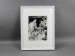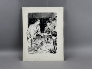 JOUBERT (Pierre) - Dessin original à l’encre de chine signé « P. Joubert » pour une illustration avec indications manuscrites au verso « Les Voleurs’’ les enfants de l’espérance Signe de Piste 1954 roman de Serge Dalens » et légendée au crayon « - ça ne t’intéresse pas de savoir ce qui est arrivé chez toi ? » Dessin format environ 19x26 cm sur bristol 25x32 cm (encadré, un pli vertical hors visuel)