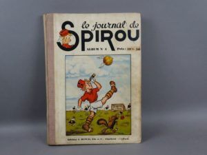RELIURE SPIROU No 4 (1939) - Recueil éditeur des numéros 18 à 34 (2ème année) - Premières pages de garde avec charnière fendue et recollée, numéro 34 recousu avec léger écartement à la reliure, très bel intérieur par ailleurs, en principe sans déchirure ni inscription (sauf omission seulement un jeu fait au crayon). Le premier plat présente deux plis assez marqués (coin supérieur fragile avec retouches de noir sur le « U »), les plats sont salis, coins et bords frottés, le dos toilé en bon état malgré l’inscription « 4 » à l’encre. Album en assez bon état général.