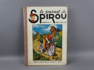 RELIURE SPIROU No 5 (1939) - Recueil éditeur des numéros 35 à 52 (2ème année) - Pages de gardes non d’origine, reliure fendue et recollée entre les numéros 36 et 37, bloc bien compact mais remboité. Une déchirure réparée en dernière page du numéro 52 sinon bel intérieur en principe sans déchirure ni inscription. Plats salis, coins et bords frottés, dos toilé en bon état. Album en assez bon état général.