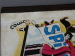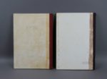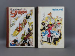 RELIURES SPIROU Nos 13 et 14 (1943) - Ensemble de 2 recueils éditeur des numéros 1 à 17 et 18 à 35 (du 2 septembre 1943, dernier numéro paru suite à l’interdiction de l’occupant, avant la reprise en octobre 1944) - Pages de garde d’origine intactes, intérieurs splendides parfaitement reliés et bien compacts (à noter une déchirure d’environ 4cm sans manque page 5 du numéro 2 du recueils 13), plats superbes malgré les inévitables traces de colle de poisson (malheureusement estompées à la gouache au premier plat du recueil 14), dos d’origine bien droits et réguliers - Magnifiques recueils en excellent état hormis le maquillage peu judicieux en couverture de l’album 14.