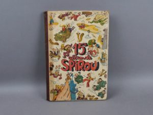 RELIURE SPIROU No 15 (1944/1945) - Recueil éditeur des numéros 1 (numéro spécial du 5 octobre 1944, reprise du journal après l’interruption de septembre 1943) au 13 de 1944 et des numéros 1 (4 janvier 1945) à 5 (1er février 1945) - Album complet mais restauré, pages de gardes changées, cahiers recollés, dos en bon état, intérieur en bel état bien compact en principe sans déchirures ni inscription, plats satisfaisants, coins et bords frottés.