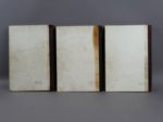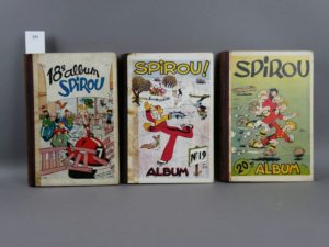 RELIURES SPIROU Nos 18, 19 et 20 (1946) - Ensemble de 3 recueils éditeur des numéros 1 de la 8ème année (équivalent au No 403) au 420 (nouvelle numérotation désormais depuis le premier numéro de 1938 à partir du numéro 404 du 10 janvier 1946), des numéros 421 à 437 et des numéros 438 à 454. Recueil 18 complet, cahiers recollés, deux pages remplacées par des photocopies, dos d’origine, coiffes renforcées par de la colle, plats en bon état légèrement salis; recueil 19 complet, première page de garde fendue à la charnière et recollée, bloc feuillets en très bel état bien compact, en principe aucune déchirure ni inscription, dos d’origine, plats en bon état malgré les inévitables traces de colle de poisson; recueil 20 complet, les pages de garde sont d’origine et non fendues, bloc feuillets recollé en début et fin d’album (quelques cahiers légèrement décalés), dos d’origine, plats en bel état.