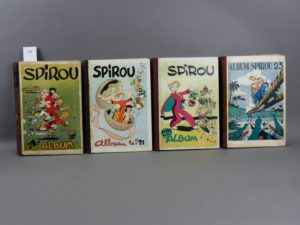 RELIURES SPIROU 1947 - Nos 21 (2 versions différentes dont variante avec 1er plat de la reliure numéro 20 de 1946 retouché en 21), 22 et 23 - Ensemble de 4 recueils éditeur des numéros 455 à 471 (en 2 exemplaires), 472 à 489 et 490 à 506 - Recueil 21 restauré notamment la partie haute du dos (sur environ un quart), petite déchirure au milieu du dos, premières pages de garde non d’origine, garde arrière manquante, bloc feuillets recollé avec léger décalage du 1er fascicule, sinon intérieur en très bel état en principe sans déchirure ni inscription, plats corrects / Recueil 21 (variante) bloc feuillets recollé avec léger décalage du 1er fascicule mais sinon bien compact en très bel état général, dos bien droit, plats tout à fait satisfaisants / Recueil 22 bloc feuillets recollé mais album entièrement d’origine en bon état général, dos bien régulier, reliure compacte, plats tout à fait satisfaisants / Recueil 23 bon état général, gardes arrières fendues à la charnière mais recollées, bloc cahiers bien compact en très bel état général, dos satisfaisant avec discrètes retouches aux coiffes.