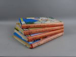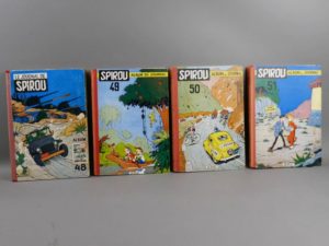 RELIURES SPIROU 1954 - Nos 48, 49, 50 et 51 - Ensemble de 4 recueils éditeur couvrant les numéros 820 à 872 - Recueil 48 en état moyen, dos refait, bloc feuillet remboité, plats corrects avec traces d’adhésifs, bords frottés avec retouches de couleurs / Recueil 49 en très bon état général / Recueils 50 et 51 en bon état général.