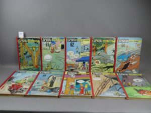 RELIURES SPIROU 1957/1958 - Nos 60 à 69 - Ensemble de 10 recueils éditeur couvrants les numéros 977 à 1080 - Recueil 60 restauré, dos refait à l’identique, un fascicule non d’origine, belle présentation / Recueils 61 à 68 en bel état général (quelques légers défauts mais complets, traces de Blanco sur l’oeuf en couverture du numéro 61) / Recueil 69 coiffes émoussées, un feuillet détaché sinon bel état.