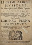 Lorenzo PENNA (1613-1693) — Li primi albori musicali. Per il principianti della musica figurata ; distinti in tre libri : Dal primo spuntano li principii del canto figurato ; dal secondo spiccano le regole del contrapunto ; dal terzo appariscono li fondamenti per suonare l’organo o clavicembalo sopra la parte. Quinta impressione.
