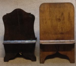 Charnières en bois. Hauteur : 46 et 51 cm (ce dernier avec des initiales gravées). Fabrication artisanale./ Ens. 2 pièces.