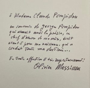 Paris, Séguier Archimbault, 1987. In-8, en feuilles, couverture rempliée, chemise toilée noire, cordons, 84 pp. Préface d’Olivier Messiaen qui signe un magnifique envoi autographe : « à Madame Claude Pompidou, en souvenir de Georges Pompidou qui aimait aussi la poésie, ce chef d’œuvre de ma mère, écrit avant et pour ma naissance, qui a conduit toute ma destinée…En toute affection et très respectueusement ». Postface de Marie Dormoy. D’abord publié au Mercure de France en 1910, ce recueil de poèmes écrits en 1908 est ici réédité à 150 exemplaires sur Hannemühe accompagnés d’une gravure de Vieira da Silva, absente de l’exemplaire.