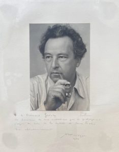 Solothurn, König. Tirage argentique (11,5 x 16,7 cm, signature du photographe en marge) contrecollée sur papier fort (23,7 x 30,8 cm), cadre de protection. Arborant fièrement sa pipe, le compositeur membre du Groupe des Six et néanmoins suisse a orné la marge du cliché d’un bel envoi autographe signé « à Bernard Gavoty, en souvenir de nos entretiens qui se prolongeront j’espère au-delà de la tutelle de Dame Radio. Bien affectueusement A. Honegger 1950 ». Traces légères et anciennes de colle en marges.