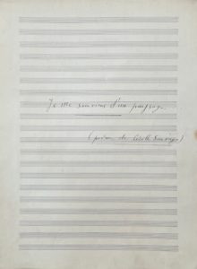 Paris, octobre 1929. 12 systèmes de 3 portées avec paroles, à l'encre, occupant 3 pp. grand in-folio, comportant quelques corrections et un ajout au crayon, le tout sous chemise avec titre à l'encre. Mélodie pour piano et voix sur un poème de sa mère, Cécile Sauvage, morte de la tuberculose en 1927.