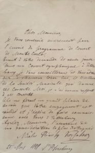 Cela me ferait un grand plaisir de savoir que votre engagement est réalisé et j'espère de faire connaissance avec vous à Pétersbourg. Agréez, Monsieur, l'assurance de ma considération la plus distinguée. [La suite, de la main du compositeur :] Nicolas Rimsky-Korsakow. 25 mars 1899. St-Pétersbourg. »
