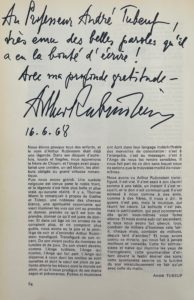 2ème série : 1960 (avec les signatures autographes de Francis Poulenc et Jacques Février), 1962 (signatures de Maurice Ohana, Narciso Yepes, Jacques Bondon, l’équipe du Deller Consort dont Alfred Deller, Antal Dorati et Sir Arthur Bliss ; André Tubeuf fait son entrée parmi les membres adhérents de la Société des Amis de la musique de Strasbourg), 1963 (avec les signatures autographes de Rudolf Serkin, Geneviève Macaux et Ken Neate, ainsi qu’un remarquable programme moderne avec un hommage à Poulenc tout récemment disparu, et des créations d’œuvres de Maurice Jarre, Marius Constant, Maurice Ohana…), 1964 (avec les signatures autographes de Marie-Claire Alain, André Vessières, Wolfgang Schniederhans, Elisabeth Dillenschneider, Marga Hoeffgen, Ken Neate, Carlos Alexander, Leonard Hokanson, Kurt Redel, Léon Algazi, Byron Janis, Joseph Keilberth, et un article signé André Tubeuf !), 1965 (avec les signatures autographes de Ralph Kirkpatrick, Paul Klecki, Claire Bernard,…et un article d’André Tubeuf sur Britten), 1966 (avec les signatures autographes d’Antoine Lippe, Nancy Tatum, Oralia Dominguez, James King, Franz Crass, Van Cliburn, Nathan Milstein,…A. Tubeuf passe Membre bienfaiteur), 1967 (Article d’A. Tubeuf sur « La Naissance de Padmâvati »), 1968 (Très bel envoi autographe d’Arthur Rubinstein en regard de l’article d’A.T. : « Au Professeur André Tubeuf, très ému des belles paroles qu’il a eu la bonté d’écrire. Avec ma profonde gratitude »), 1969, 1970 et 1971 (pas de signatures autographes de musiciens…et un seul article d’A. Tubeuf pour ces trois dernières années). S’y ajoute le programme du Festival Bach à Strasbourg en 1935 (Chœur de l’Église Saint-Guillaume). Soit 16 volumes, petits défauts.