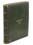 Plein chagrin maroquiné vert anglais, 8 lames cartonnées avec double logements de photos, tranches dorées, premier plat historié « Bayreuth 1892, B.T. ». 16 photographies de type Cabinet, en excellent état, rares témoignages des premières distributions et des lieux associés : le monument et la salle, un décor pour Parsifal, les cantatrices et chanteurs en costumes pour Parsifal, Tannhäuser, Tristan et Isolde… Les fragiles affichettes programmes du Bühnenfestspielshaus Bayreuth de la même année sont jointes, occasion de repérer les noms des protagonistes des photos si jamais on ne s’y reconnaissait pas : Van Dyck en Parsifal, Malten en Kundry, Kaschmann en Amfortas,…Grüning en Tannhäuser, Welschke en Elisabeth…Vogl en Tristan, Sucher en Isolde…Superbe réunion, pour wagnérophiles avertis ! Bel état général, sans le fermoir, quelques épidermures.