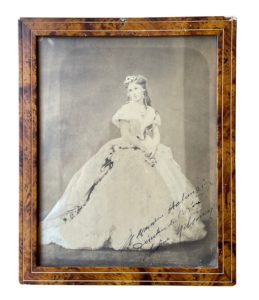 Paris, c. 1870. (21,6 x 27,8 cm.), tirage photographique type grand cabinet), encadrée. Envoi autographe signé à « monsieur Halanzier, Directeur de l’Opéra » par Christine Nilsson en somptueuse robe de Violetta. Hyacinthe Halanzier-Dufresnoy (1819-1896) fut le premier directeur de l’Opéra Garnier, il dirigeait auparavant la Salle Le Peletier qui brûla en 1873.