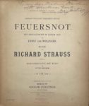 *Feuersnot, opus 50. Berlin, Adolph Fürstner, 1901, broché, 201 pp. Premier tirage de la réduction piano et chant, sans la première couverture mais avec un envoi autographe signé de Mary Münschoff « to my dear Madame Marchesi ».