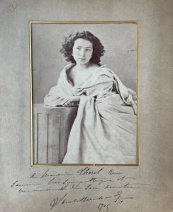 [c. 1860.] (17,3 x 25 cm avec le carton original). Portrait de face, d’un charme envoûtant. Très bel envoi sur la marie-louise (28 x 36 cm) : « à Monsieur Thorel René / Souvenir très sympathique et / reconnaissant de son amitié » signé et daté 1905. Petits accidents.