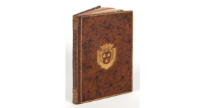 RELIURE DU XVIIIe SIÈCLE. Veau marbré, décor doré, armes au centre des plats, filet en encadrement, dos long avec titraison verticale, tranches rouges.