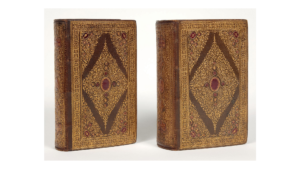 Maroquin brun, grand décor doré aux petits fers, motif en losange et écoinçons, mosaïques de médaillons de maroquin rouge et citron, encadrement avec répétition d'un fer et bordé de doubles filets, dos longs richement mosaïqués avec titraison horizontale dans le caisson supérieur, papier de garde homogène avec un filigrane impérial aux aigles bicéphales, tranches dorées
