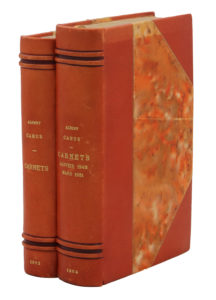 Paris, Gallimard, 1962-1964. 2 volumes in-8, demi-maroquin orangé avec coins, dos à faux-nerfs orné de filets à froid maigres et gras, tête dorée, non rogné, couverture et dos (Reliure de l'époque).Édition originale des deux premiers tomes des Carnets de Camus, couvrant les années 1935-1951. Le troisième (1951-1959) n'est paru qu'en 1989.