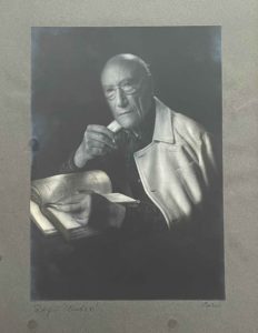 Beau portrait de Gide par Rogi André, née Rozsa Klein (1900-1970). L'écrivain y est représenté en buste, tenant un livre ouvert dans une main et une cigarette dans l'autre.
