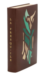 Paris, José Corti, 1970. In-12, box noisette, large composition abstraite sur les plats mosaïquée en pièces de box irrégulières de différentes teintes de vert et de beige, dos lisse titré à la verticale, doublure et gardes de daim beige bordées d'un listel de box sable, tranches dorées, couverture et dos, chemise et étui gainés du même box (C. et J.-P. Miguet, 1986).Édition originale.