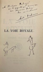 On joint une lettre autographe signée de l'auteur adressée à Marcel Gras, critique littéraire au Petit Marseillais, le 3 novembre 1930 : « J'ai lu avec le plus vif intérêt la critique que vous avez bien voulu consacrer à La Voie royale. J'accepte d'autant plus volontiers vos réserves que je n'ai aucunement la prétention d'écrire des livres “réussis”. Mon objet n'est pas là... » (une page à en-tête de la NRF avec enveloppe jointe).