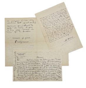 3° une lettre autographe signée d'André Fraigneau à André Malraux, s.d. : « J'ai appris, en même temps, que vous êtes un homme qui prouve ses livres et que ses livres prouvent. Vous être dérangé de chez vous pour moi seul (moi en tant qu'homme qui appelle bien entendu) et puis, ce début de la "Condition humaine". Jamais on avait appris que servir ou tuer était le même geste, et que "l'humain pur" [biffé : dont j'ai parlé] était atteint à ce moment de solitude la plus vive. [...] Convenons que j'attends "la suite" du livre et que ce sera ma tournée de "verres" après le bureau. »