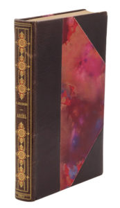Paris, Émile-Paul frères, 1924. In-8, demi-maroquin brun avec coins, dos lisse orné en long de motifs mosaïqués et dorés, tête dorée, non rogné, couverture et dos (J. van West).Première édition illustrée, ornée d’un frontispice colorié et de 38 vignettes en noir par Hermine David.
