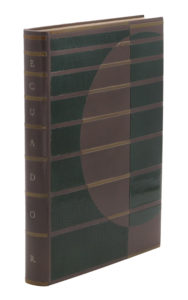 Paris, Gallimard, 1929. Petit in-4, box taupe, importante composition géométrique mosaïquée sur les plats alternant pièces de box et de lézard vert foncé et listels horizontaux de box kaki ou en réserve, dos lisse orné de listels mosaïqués et titré verticalement au palladium, doublure et gardes de daim gris bordées d’un listel de box gris clair, tranches dorées sur témoins, couverture et dos, chemise et étui gainés du même box (C. et J.-P. Miguet).Édition originale.