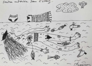 On joint un dessin original au stylo signé de Gisèle Prassinos (15 x 10,5 cm), intitulé Sondue endormie dans l'étang.