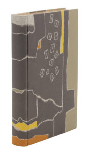 Paris, Gallimard, 1985. In-8, bradel cartonnage anthracite orné de découpes de papier collé gris clair, blanc, jaune et orangées, titre en lettres découpées et collées sur le premier plat, dos lisse muet, tête dorée, non rogné, couverture et dos, chemise et étui (Honnelaître, 1996).Édition originale.