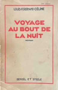 Voyage au bout de la nuit. Paris, Denoël & Steele, 1932. In-12, broché. Réimpression en offset de l'édition originale réalisée par l'Imprimerie française de l'Édition, avec mention de 104e édition sur la couverture et sans les feuillets d'annonces. Couverture défraîchie, premier plat détaché.
