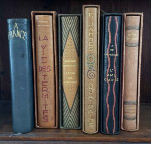MAETERLINCK (Maurice). La Vie des termites. In-8, box marron, décor mosaïqué composé du titre et de bandes de box noir et rouge, dos lisse titré à froid, tête dorée, couverture et dos, étui. Édition originale. Dos passé.