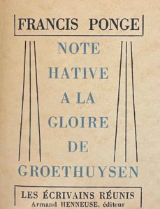Note hâtive à la gloire de Groethuysen. Lyon, Armand Henneuse, 1951. In-16, cartonnage gris brillant, dos lisse à l'imitation de peau de serpent, couverture et dos, étui (A. Boige, 2002). Édition originale. Un des 50 exemplaires sur chine, seul grand papier.
