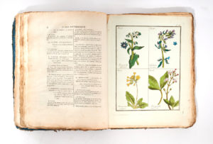 Une grande carte dépliante, 6 tableaux avec feuilles, racines, tiges… et 62 planches gravées sur cuivre reproduisant 248 plantes de la flore de Paris. Toutes les planches ont été finement coloriées à l’époque.