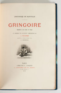Théodore de BANVILLE. — Gringoire. — Paris, Conquet et Carteret, 1899. — In-8, demi-maroquin bleu canard à coins, dos lisse orné de 13 filets dorés horizontaux passant sur les plats et pièces de titre mosaïquées de maroquin chaudron,...