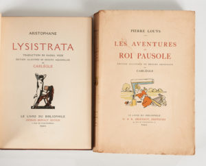 [CARLÈGLE]. — ARISTOPHANE. — Lysistrata. — Paris, Briffaut, 1928. — In-4, demi-peau maroquinée, à bandes, dos lisse orné (Reliure de l'époque). — Pierre LOUŸS. — Les Aventures du Roi Pausole. — Ibid., id., 1924. — In-4, broché.