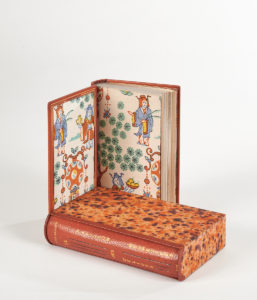 doublure et gardes de soie à décor sinisant, doubles gardes, tranches dorées sur témoins, couverture et dos, chemise demi-maroquin chaudron à recouvrement, étui (Franz).