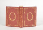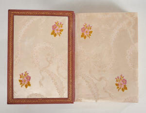 orné dans le même goût, encadrement intérieur orné d’une roulette florale et de filets dorés, doublure et gardes de soie brochée à motif floral, doubles gardes, tranches dorées sur témoins, couverture et dos, chemise et étui (Franz).