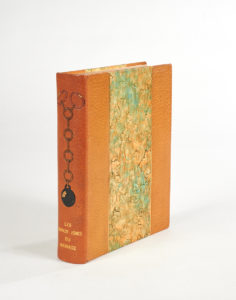 Les QUINZE JOIES DU MARIAGE. — Paris, Kieffer, 1930. — Petit in-4, demi-maroquin havane à bandes, dos lisse orné en long d’un motif mosaïqué représentant une chaîne reliant deux alliances à un boulet, tête dorée, couverture et dos,...