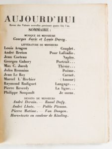 9. ARAGON, BRETON, COCTEAU Aujourd'hui. Musiques, poèmes, dessins, proses. Revue des Valeurs nouvelles paraissant quatre fois l'an. Paris, A la Belle Édition, 1919, in-4, broché, étui et emboîtage. Seul numéro paru de cette revue, tiré à 426 exemplaires. Textes de Aragon, Breton, Philippe Soupault, Cocteau, etc. Illustré d'un pochoir en couleurs de Moïse Kissling, de gravures sur bois et dessins de A. Lhote, R. Dufy, Pablo Picasso, Van Dongen, André Derain. Petit manque angulaire à l'avant-dernier feuillet.