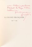 24. ARAGON (Louis). La Diane française, 1942-1944. ¨Paris, Éditions Pierre Seghers, Collection Poésie 44, 1944, in-12 carré, maroquin grenat, dos lisse, auteur et titre dorés en long, tranches dorées sur brochure, étui (P.-L. Martin, 1967). Édition originale. 1/120 exemplaires sur vergé d'Arches. Un tirage spécial de 12 exemplaires sur Chine a été fait pour la Librairie Blaizot. Envoi de Louis Aragon, à l'encre rouge. « pour Catherine, ce livre d'avant le temps d'être Catherine Sentiment Aragon »