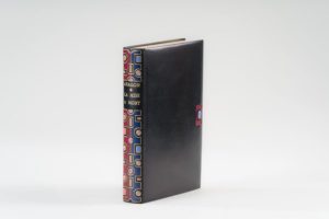 31. ARAGON (Louis). La Mise à mort. Roman. Paris, Gallimard, 1965, in-8, box noir, dos lisse mosaïqué de figures géométriques courbes et rectangulaires de box rose et rouge, bleu ciel et bleu nuit, sertis de filets dorés, rappel de ce décor sur l'extérieur des plats incrusté et mosaïqué, gardes de daim vieux rose, auteur et titre doré au dos, tranches dorées sur brochure, couverture et dos conservés, étui (P.-L. Martin, 1958). Édition originale. 1/145 exemplaires sur vélin pur fil Lafuma-Navarre, second papier. Bel envoi à Pierre Consten. « pour les yeux, l'oreille et la mémoire, et ces prothèses qui lui font croire, voir, entendre et se souvenir les mille et uns narcis d'Aragon (signature) ».