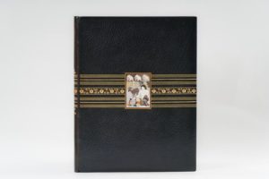 40.1 BARRUCAND (Victor). Le Chariot de terre cuite. D'après la pièce du théâtre indien attribuée au roi Soudraka. Illustrations de Léon Carré. Paris L'Édition d'Art H. Piazza, 1921, in-4, maroquin vert, dos lisse, décor de filets, pointillés et décor floral mosaïqué traversant les plats et le dos, cartouche rectangulaire au centre du premier plat avec un décor mosaïqué de nacre (trois éléphants surmontant une femme s'occupant d'une chèvre), doublure d'une bande de marquis vert et brun soulignés de filets dorés, gardes de soie verte, tranches dorées, couverture et dos conservés, étui (G. Lévitzky). 1 / 135 exemplaires sur Japon impérial (second papier), avec un état en noir sur vélin mince. Bel composition typographique avec un décor de feuillages et de fleurs en bandeau et en encadrement du texte vert et ocre d'après les peintures décoratives d'art bouddhique. 20 planches en double état, noir et couleurs. Dos passé