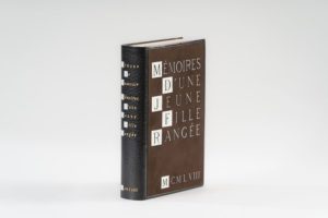 45. BEAUVOIR (Simone de). Mémoires d'une jeune fille rangée. Paris, Gallimard, 1958, in-8, maroquin bleu nuit, plats incrustés de daim brun, titre de l'ouvrage et date de l'édition mosaïqués sur le premier plat en grandes capitales de box bleu ciel, première lettre de chaque mot incrusté et mosaïqué dans un carré de dentelle, auteur, titre et date au dos en lettres dorées, première lettre de chaque mot en lettre dorée sur carré de box bleu ciel, tête dorée sur brochure, couverture et dos conservés chemise, étui (P.-L. Martin, 1964). Édition originale. 1/25 exemplaires sur Hollande Van Gelder, celui-ci non justifié. La reliure est à rapprocher de celle exécutée en 1966 pour le même ouvrage et présentée dans la vente J.-P. G. (17 et 18 mai 1995, n° 49).