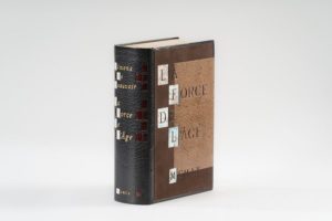 46. BEAUVOIR (Simone de). La Force de l'Âge. Paris, Gallimard, 1960, in-8, maroquin noir, plats recouverts de daim havane, sur le premier plat un grand rectangle en papier granité havane clair, titre et date en grandes capitales mosaïqués de box brun foncé, chaque initiale dans un carré incrusté de papier tiré d'une carte d'état-major, dos lisse orné de petits rectangles de box bordeaux, auteur, titre et date en lettres dorées, première lettre de chaque mot en lettre dorée sur carré de box bleu ciel, tête dorée sur brochure, couverture et dos conservés chemise, étui (P.-L. Martin, 1964). Édition originale. 1/30 exemplaires sur vélin de Hollande van Gelder (n° 14), premier papier. La reliure est presque identique de celle exécutée en 1966 pour le même ouvrage et présentée dans la vente J.-P. G. (17 et 18 mai 1995, n° 50).