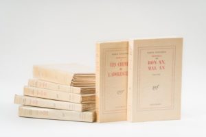 144. JOUHANDEAU (Marcel). Mémorial. Paris, Gallimard, 1948-1972, 7 volumes in-12, brochés, là plupart non coupés. Éditions originales. I. Les Livre de mon père et de ma mère. 1948. 1/13 sur vélin de Hollande. II. Le Fils du boucher. 1951. 1/750 sur vélin labeur. Envoi. III. La Paroisse du temps jadis.1952. 1/35 sur vélin de Hollande. Exemplaire n° 1. Envoi. IV. Apprentis et garçons. 1953. I/30 sur vélin de Hollande. Exemplaire n° 1. envoi. V. Le Langage de la tribu. 1955. 1/30 sur vélin de Hollande. Envoi. VI. Les Chemins de l'adolescence. 1958. 1/3 sur vélin de Hollande. Envoi. VII. Bon an, mal an. 1972. 1/3 sur vélin de Hollande. Envoi.