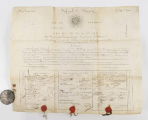 1830 [Anno Lucis 5830] Dimensions : 510 x 415 mm Sceaux de cire rouge ; signatures manuscrites ; sceau sous emboitage de fer blanc. Document plié. Bon état général de conservation.