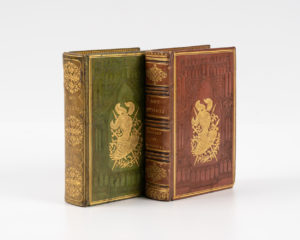 ƒ CERVANTES SAAVEDRA (Miguel de) El ingenioso hidalgo Don Quijote de la Mancha Edicion en miniatura. Paris, Jules Didot, 1827. 2 vol. In-16, veau (diverses teintes : blond, fauve, rouge, vert…), double filet doré, plaque à la cathédrale à...